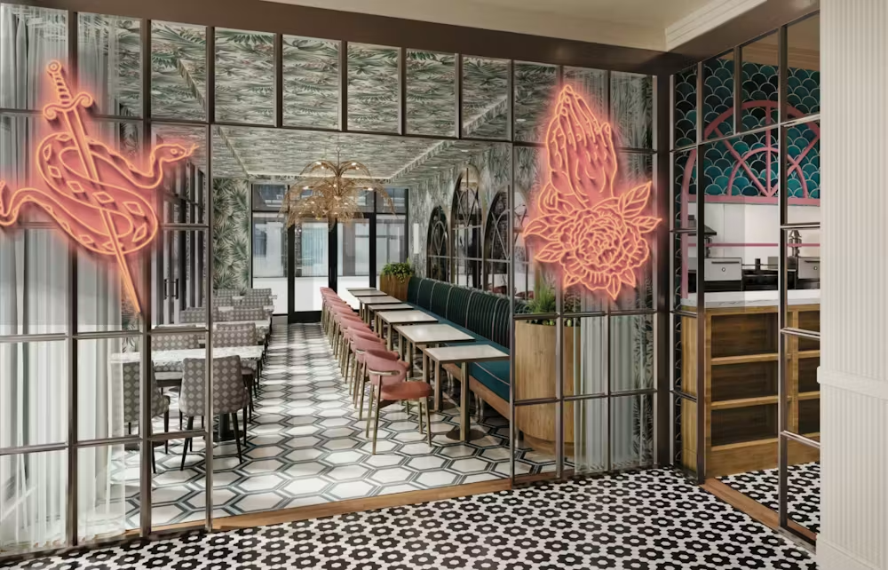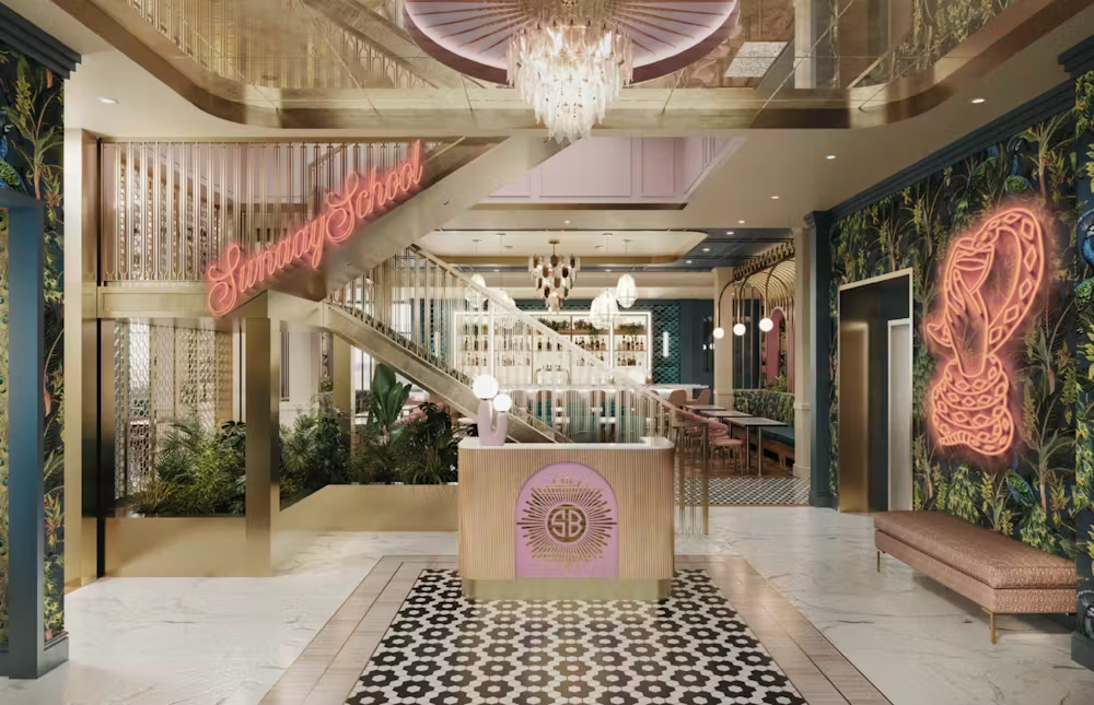 Sunday School, the coveted Champagne & Cocktail Lounge sitting above Sunday’s Best on the 2nd floor, is a never-seen-before rooftop experience welcoming guests 21 and older to a South Beach Style Resort vibe making you feel like you’ve been transported to an oceanside escape without ever leaving the city. This dreamy lounge is filled with captivating pink & gold accents, lush greenery, open rooftop-endcap atriums and overlooks the cityscape providing a never ending sparkle!